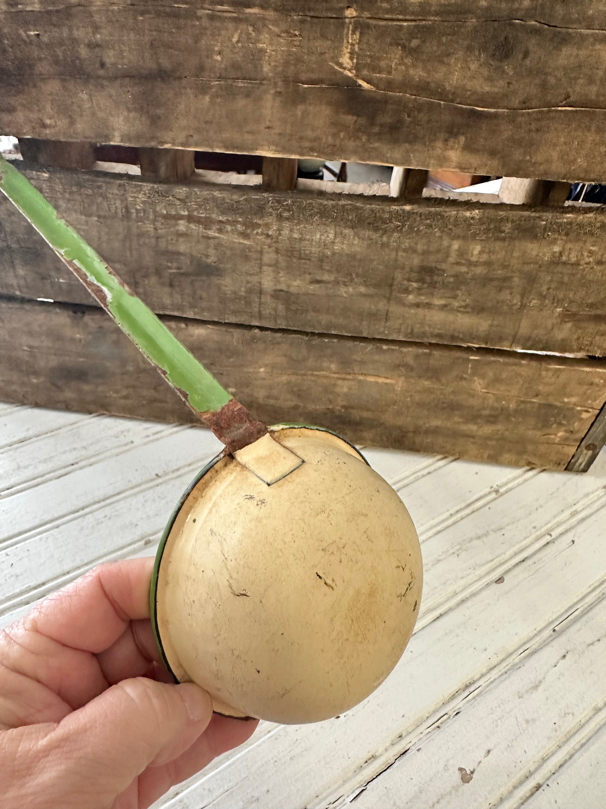 Green trimmed enamel ladle